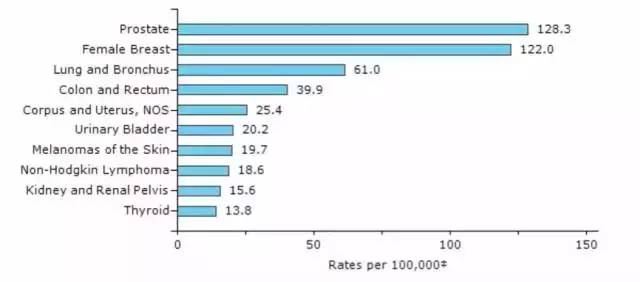 癌癥是美國死亡率第二高的疾病。不過事實上并不像我們小時候看的電視劇一樣,一得癌癥就必死無疑,并不是所有癌癥都等于直接判死刑。癌癥(cancer)這個詞源于希臘語,在希臘語中是“螃蟹”的意思,因為某些腫瘤中的肉和血管膨脹扭曲看起來很像橫行的螃蟹,所以被稱為cancer,這簡單的一個詞代表著100多種不同的癌癥。上圖來自美國疾病控制中心,展示了患病率最高的癌癥,他們分別是前列腺癌、乳房癌、肺和支氣管癌、結腸和直腸癌子宮癌、尿道和膀胱癌、黑色素皮膚癌、非何杰金氏淋巴瘤、腎癌、甲狀腺癌。病因可能是遺傳,也可能是不良的生活習慣——如吸煙、節(jié)食、太陽暴曬等。