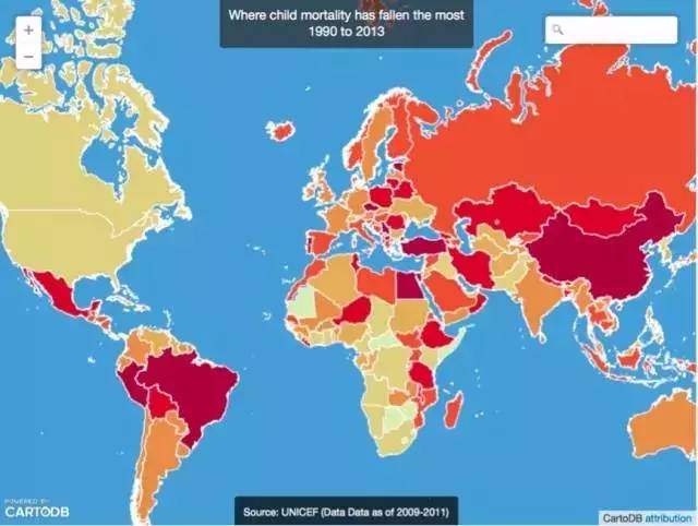 聯(lián)合國兒童基金會的數(shù)據(jù)顯示,從1993年至2013年這23年間,全球兒童死亡率下降了近一半。圖片反映了各地兒童死亡率下降的情況,顏色越暗死亡率下降的越多。