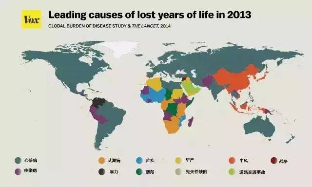 雖然在美國這類的發(fā)達國家,奪人性命的主要是心臟病和癌癥這種慢性殺手,但這并不能代表全世界的情況。這張圖表展現(xiàn)了人們喪命的原因??梢宰⒁獾侥承﹪胰栽诤桶滩〉葌魅拘约膊《窢帲瑧?zhàn)爭、交通事故、早產(chǎn)、暴力仍是造成死亡的主要原因。生活在這些地區(qū)的人可能根本就無法感受到什么“老齡社會帶來的煩惱”,“病病殃殃的活著的糾結”,因為他們很難活到那個階段。