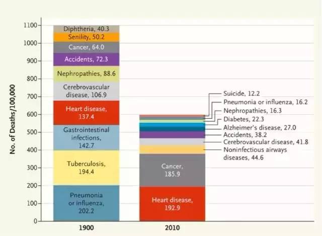《新英格蘭醫(yī)學雜志》對上個世紀美國人的死亡原因進行了分析,發(fā)現(xiàn)了一個變化。隨著醫(yī)藥學的發(fā)展,人們對疾病理論理解的深入,死于傳染病病原體(如肺結核和肺炎)的人越來越少。更多的人死于例如癌癥、心臟病和其他由于年老身體各部分節(jié)能衰弱(阿爾茨海默癥等)而引發(fā)的慢性疾病。