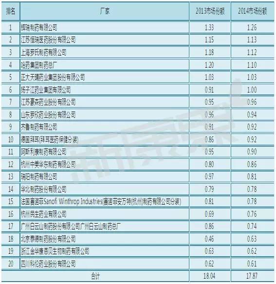 2014年,城市等級(jí)醫(yī)院銷售市場(chǎng)份額TOP20的廠家,累計(jì)市場(chǎng)份額為17.87%,較去年同期有所下降。其中,市場(chǎng)份額大于1%的廠家有6個(gè)。與去年同期相比,市場(chǎng)份額擴(kuò)大的廠家有8個(gè),縮小的有12個(gè)。