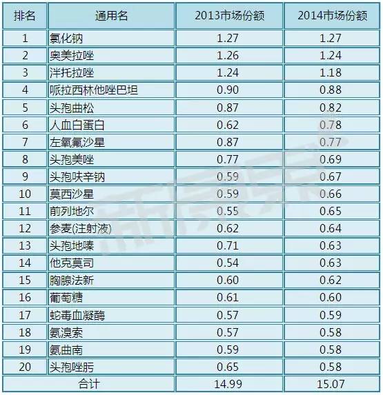 2014年,城市等級(jí)醫(yī)院銷售市場(chǎng)份額TOP20的通用名以化學(xué)藥居多,累計(jì)市場(chǎng)份額為15.07%,與2013年基本持平。其中,市場(chǎng)份額大于1%的藥品通用名是氯化鈉、奧美拉唑、泮托拉唑。與去年同期相比,市場(chǎng)份額擴(kuò)大的通用名有9個(gè),持平的1個(gè),縮小的10個(gè)。