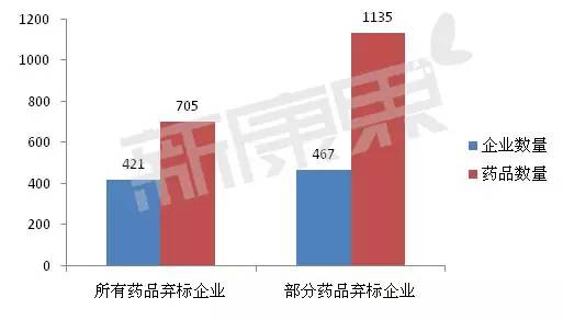 經(jīng)過(guò)兩輪投標(biāo)(直接價(jià)格降幅篩選和全國(guó)最低價(jià)篩選),最終棄標(biāo)的藥品為888個(gè)企業(yè)的1840個(gè)品規(guī),棄標(biāo)率35.4%,包含了1400個(gè)通用名。其中,所有藥品棄標(biāo)的企業(yè)有421個(gè),棄標(biāo)藥品705個(gè)品規(guī),部分藥品棄標(biāo)(單一通用名的多種規(guī)格藥品選擇一種規(guī)格投標(biāo)或部分通用名藥品棄標(biāo))的企業(yè)有467個(gè),棄標(biāo)藥品1135個(gè)品規(guī)。