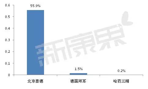 浙江省等級(jí)醫(yī)院中,2014年前列地爾的銷售額為3.6億元,市場(chǎng)份額0.65%,在所有通用名中排名第11位,供應(yīng)企業(yè)有7家,其中兩家屬于哈藥集團(tuán),分別是哈藥集團(tuán)三精加濱藥業(yè)有限公司、哈藥集團(tuán)生物工程有限公司。本次選擇棄標(biāo)的企業(yè)是北京泰德制藥股份有限公司(2個(gè)品規(guī))、德國(guó)BayerHealthCareAG(珠海許瓦茲分裝)(1個(gè)品規(guī))、哈藥集團(tuán)三精加濱藥業(yè)有限公司(1個(gè)品規(guī)),共計(jì)4個(gè)品規(guī)。從圖7中可以看出,北京泰德的市場(chǎng)份額大幅高于其余兩個(gè)棄標(biāo)企業(yè),達(dá)到55.9%,在浙江等級(jí)醫(yī)院的前列地爾類藥品中市場(chǎng)份額最高,棄標(biāo)后企業(yè)應(yīng)該會(huì)選擇轉(zhuǎn)移需求,拓展藥店渠道,成功概率較高;德國(guó)拜耳市場(chǎng)份額很低,或?qū)⑦x擇放棄浙江市場(chǎng);哈藥三精棄標(biāo)后,哈藥集團(tuán)生物工程有限公司中標(biāo),哈藥集團(tuán)在浙江省仍會(huì)供應(yīng)該類藥品。