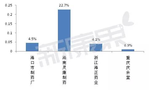 浙江省等級(jí)醫(yī)院中,2014年氨曲南的銷售額為3.2億元,市場(chǎng)份額0.58%,在所有通用名中排名第19位,供應(yīng)企業(yè)有13家,市場(chǎng)競(jìng)爭(zhēng)激烈。本次選擇棄標(biāo)的企業(yè)有4家,分別是??谑兄扑帍S有限公司、海南靈康制藥有限公司、浙江海正藥業(yè)股份有限公司、重慶市慶余堂制藥有限公司。其中,海口市制藥廠有限公司、重慶市慶余堂制藥有限公司均提供2種規(guī)格的氨曲南,浙江海正藥業(yè)股份有限公司提供1種規(guī)格的氨曲南,三家藥企均全部棄標(biāo);海南靈康制藥有限公司提供3種規(guī)格,只有1種棄標(biāo)。從圖9可以看出,選擇全部棄標(biāo)的三家藥企市場(chǎng)份額偏小,需求轉(zhuǎn)移的可能性偏低,海南靈康制藥的棄標(biāo)率只有三分之一,不影響其在醫(yī)院終端的銷售,再加上浙江氨曲南的供應(yīng)企業(yè)較多,棄標(biāo)企業(yè)的市場(chǎng)會(huì)很快被“蠶食”。因此,該類藥品需求轉(zhuǎn)移的概率不大,只是醫(yī)院終端的市場(chǎng)格局將會(huì)有所調(diào)整。