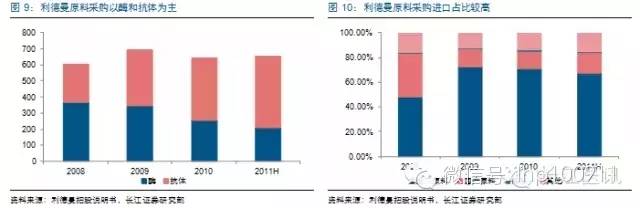 由于生產(chǎn)工藝、產(chǎn)物純度等因素影響,國產(chǎn)原料離生產(chǎn)要求仍存在一定差距,目前診斷酶、抗體等主要原料仍依賴國外進口。以2011年上市的利德曼為例,2008年-2011年中進口原料成本費用均在總成本50%以上,其中2011年進口原料成本占比67.19%??紤]到利德曼是少數(shù)原料研發(fā)上有較多突破的公司,我們預(yù)計全國原料平均進口成本占比在70%以上。