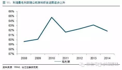 目前國內(nèi)各大診斷試劑龍頭均加大原料研發(fā)力度,掘取上游原料毛利。如利德曼自上市以來一系列諸如乙肝表面抗原、乙肝e抗體、甲狀腺球蛋白原料的研發(fā)成功,獲得上游原料利潤溢價,促使公司毛利不斷提升。至2014年,公司毛利率61.83%。(2011年公司上市,2010年毛利率相對較高)