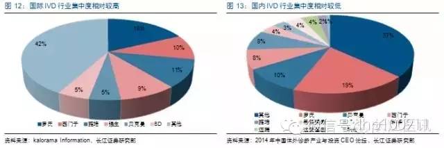目前國際體外診斷市場行業(yè)集中度相對較高,羅氏、西門子、雅培、強生、貝克曼、BD等6大企業(yè)占據(jù)體外診斷市場近60%的市場份額,壟斷優(yōu)勢明顯。國內(nèi)行業(yè)集中度相對較低,規(guī)模最大的的科華生物2014年營業(yè)收入12.18億元,相較于2014年305億元的國內(nèi)市場,市場占有率不到4%,國內(nèi)企業(yè)集中度相對較低,同時也意味著國內(nèi)企業(yè)未來有更多的發(fā)展機遇。