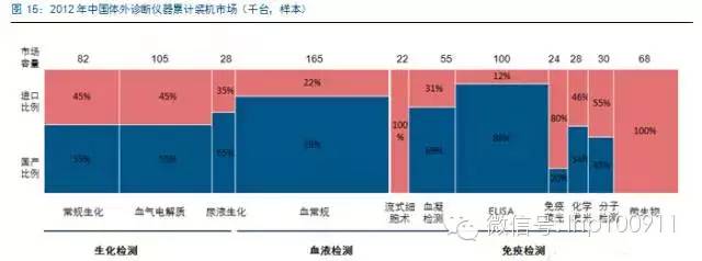 儀器方面,多領(lǐng)域逐漸完成進口替代。相對于國產(chǎn)試劑的弱勢,在體外診斷儀器方面,國內(nèi)制造在多個領(lǐng)域已經(jīng)取得較大的突破。生化檢測國產(chǎn)儀器市占率2012已超過進口儀器。免疫診斷儀器進口替代正在進行中,2012年即使免疫診斷中相對高端的化學(xué)放光儀器市場占有率也已達到54% 。而更為高端的分子診斷、微生物診斷、流式細胞診斷儀器則更多依賴進口。