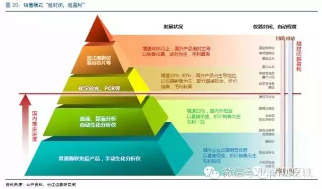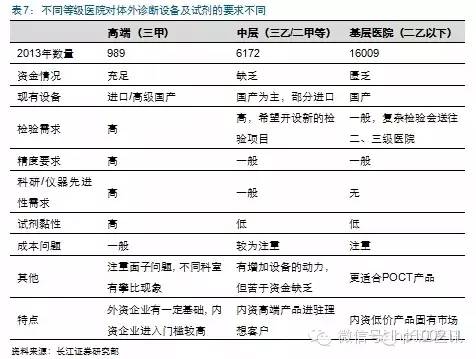 高端醫(yī)院重技術(shù),低級醫(yī)院重成本,中級醫(yī)院是國產(chǎn)品牌理想客戶。高端三甲醫(yī)院由于外資產(chǎn)品的先入為主,加之對科研和設(shè)備品牌的追求,更有意愿使用高通量、全自動的進口產(chǎn)品或高端檢測方法,此外較高的門診量,病人經(jīng)濟承受力也足以支撐高端設(shè)備的運作。而基層醫(yī)院由于經(jīng)費和病人數(shù)目有限,難以形成規(guī)模效應(yīng),對高通量的新檢測技術(shù)需求并不大。