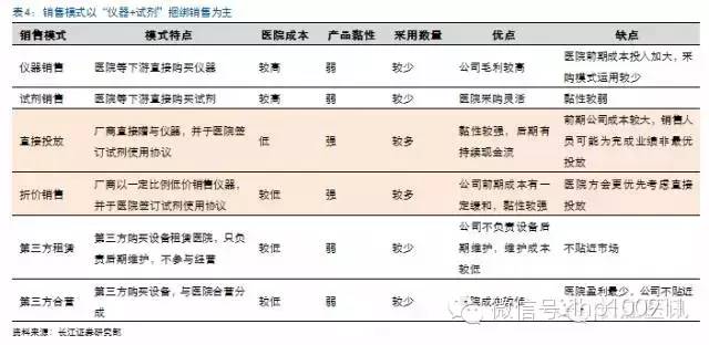 銷售模式以“儀器+試劑”捆綁銷售為主。體外診斷設(shè)備或試劑的銷售模式主要有儀器或試劑的直接銷售、直接投放、折價銷售、第三方租賃與第三方合營等模式。其中直接投放最為普遍,廠商免費贈與設(shè)備并合同約定在未來的一段時間內(nèi)需購買其對應(yīng)試劑。這種營銷模式在一定程度上保證了客戶黏性,但在實際操作過程中往往由于銷售人員為完成業(yè)績而非最優(yōu)投放而有較大的損失。折價銷售在一定程度上避免了此類問題的出現(xiàn),但作為下游醫(yī)院方會優(yōu)先考慮直接投放模式。因此實際過程中兩種銷售模式各有所長,主要看看廠商與醫(yī)院方的議價能力與技術(shù)先進程度等。
