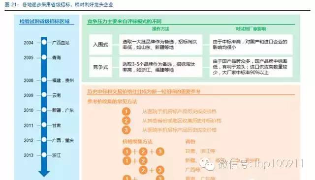 傳統(tǒng)體外診斷設(shè)備及試劑招標一般為各地醫(yī)院自主招標采購。自2004年廣西省血站采用省級招標后,此后9年青海、福建、貴州、云南、新疆、廣東、甘肅、廣西、重慶、浙江等11省陸續(xù)采用省級招標。
