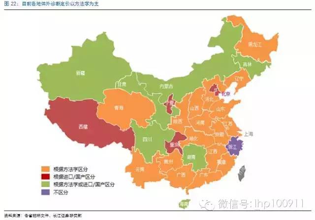 原有的定價方式大體分為按方法學(xué)、按進口國產(chǎn)區(qū)分、兩種方法的混用等以對方法不做不同的定價。目前近1/2省、市、自治區(qū)、直轄市采用方法學(xué)進行定價,主要集中于華東、華南、黑龍江等地。而近1/3采取方法學(xué)或進口/國產(chǎn)混用,主要集中于中部及北部地區(qū),在這些地區(qū)兩種方法都有所使用。截至2014年,僅浙江省采取不分方法學(xué)定價。