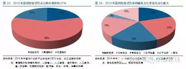 下游醫(yī)院市場是體外診斷市場的主要消費終端之一。2013年國內(nèi)醫(yī)院檢驗試劑采購總額約45億美元,占醫(yī)院耗材類采購總量21%,預(yù)計占全國體外診斷試劑使用量九成以上;其中化學(xué)發(fā)光與酶聯(lián)免疫試劑占比最高,分別占試劑使用量的23%、20%,血液監(jiān)測占比19%,常規(guī)生化18%,分子診斷4%。