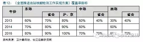從2010年開始,我國已經(jīng)在部分省級血站和血制品企業(yè)開始血篩試點,2013年5月,《全面推進血站核酸檢測工作實施方案(2013-2015年)》中明確提出東中西部地區(qū)2013-2015年核酸檢測占比需達到的目標。