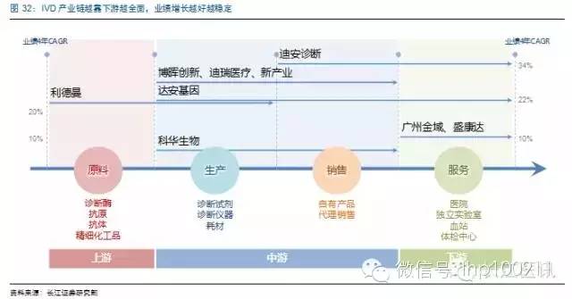 比較行業(yè)內(nèi)主要的幾家公司產(chǎn)業(yè)鏈布局和利潤增長情況也可發(fā)現(xiàn),產(chǎn)業(yè)鏈越齊全越靠下游,業(yè)績越好越穩(wěn)定。迪安診斷深耕華東第三方獨立診斷試驗室市場,業(yè)績增長迅速,潛力巨大。達安基因布作為分子診斷龍頭,以中山大學(xué)醫(yī)學(xué)體系為依托,獨立診斷實驗室為平臺,布局產(chǎn)業(yè)鏈生產(chǎn)、銷售、服務(wù)領(lǐng)域。而廣州金域、利德曼等公司布局產(chǎn)業(yè)鏈較短則同期增速在10%左右,目前利德曼正不斷加大上游原料研發(fā)力度并升級原有生化診斷產(chǎn)品,未來有獲得產(chǎn)業(yè)鏈協(xié)同收益。