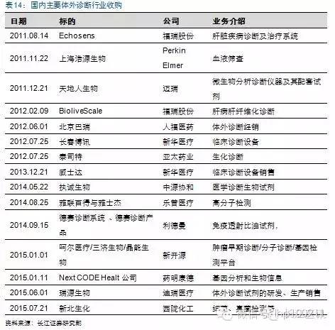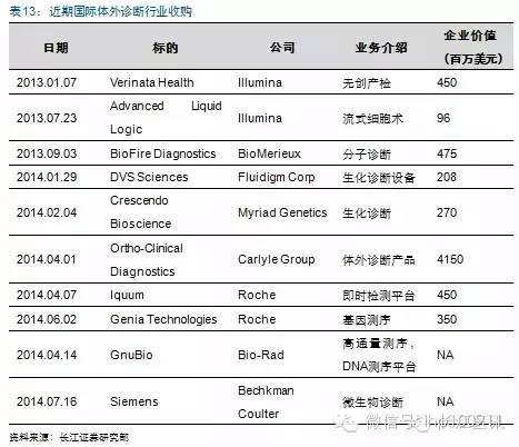 而完善產(chǎn)業(yè)鏈最迅速最有效的方式即為優(yōu)質(zhì)資產(chǎn)的并購,從2013年初至當前海外關(guān)于體外診斷并購已經(jīng)超過10起,其中最大的為Carlyle Group對Ortho-Clinical Diagnostics的收購,價值總額41億美元。