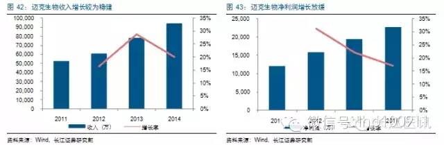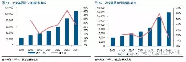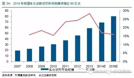 公司生化檢測起步,現(xiàn)有127項生化診斷試劑,3種11規(guī)格全自動生化分析儀,涵蓋11類生化檢測項目。技術(shù)儲備豐富,在研診斷酶14項、抗原抗體11項目、生化試劑7項、免疫試劑14項(其中化學(xué)發(fā)光10項)、配套化學(xué)發(fā)光儀及POCT設(shè)備4項目,未來不排除進軍分子檢測領(lǐng)域。近年公司生化檢測增長迅速,三年CAGR在40%以上,未來若外延布局免疫、分子等高端領(lǐng)域,想象空間廣闊。(市值:美康128億元,達安301億元;2014年凈利潤:美康1.37億元,達安1.59億元;市占率:美康2.13%,達安2.44%)。