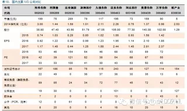 目前國內(nèi)市場主要上市公司標的有傳統(tǒng)龍頭企業(yè)科華生物、利德曼、達安基因;近期上市的如迪瑞醫(yī)療、九強生物、邁克生物、潤達醫(yī)療、美康生物等。其中達安基因、美康生物擁有第三方獨立診斷實驗室,邁克生物化學(xué)放光領(lǐng)域優(yōu)勢明顯,萬孚生物則在POCT方面有較大優(yōu)勢。