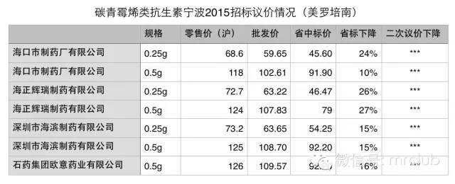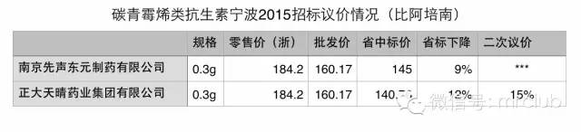 先聲和正大天晴兩個比阿培南在浙江備案的零售價是一樣的,因為比阿培南廠家少,先聲在省標時報了一個謹慎的價格,較批發(fā)價來說僅降了9個點,正大天晴則降了12個點,前天寧波二次議價結(jié)果出來如何呢?據(jù)說在此基礎(chǔ)上又降了15個點,但仍然出局了!