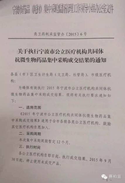 昨日,有業(yè)內(nèi)微友向賽柏藍(lán)透露,寧波的抗微生物藥品的二次議價(jià)結(jié)果在8月26日已正式印發(fā)。