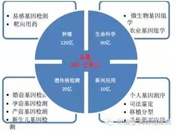 其中,腫瘤學(xué)120 億美元、生命科學(xué)50 億美元(包括生命科學(xué)工具、復(fù)雜病癥,農(nóng)業(yè)基因以及影響因子和宏基因組)、生育和基因健康20 億美元(孕婦和新生兒童的檢測(cè),以及基因健康)、其他應(yīng)用10 億美元。