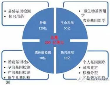 其中,腫瘤學(xué)120 億美元、生命科學(xué)50 億美元(包括生命科學(xué)工具、復(fù)雜病癥,農(nóng)業(yè)基因以及影響因子和宏基因組)、生育和基因健康20 億美元(孕婦和新生兒童的檢測(cè),以及基因健康)、其他應(yīng)用10 億美元。