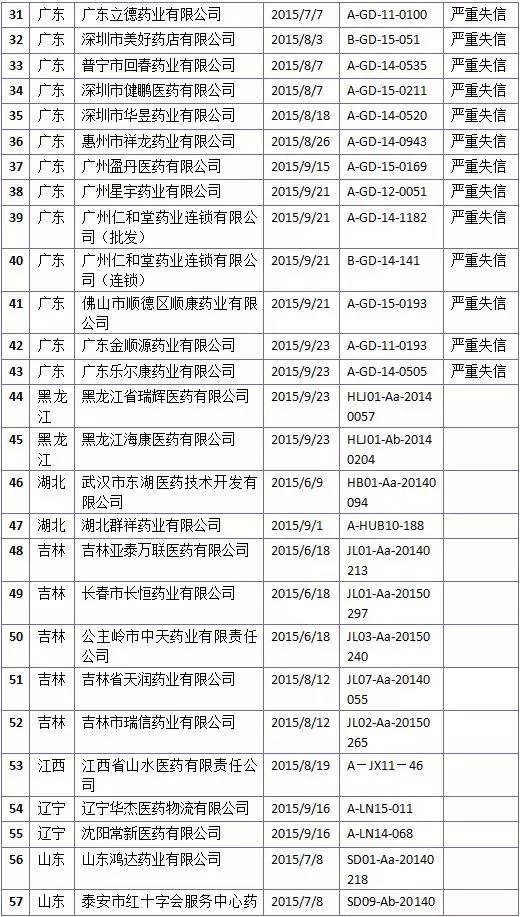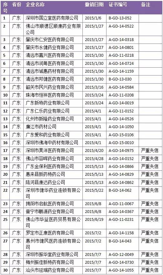 導(dǎo)讀 據(jù)不完全統(tǒng)計(jì),截止至9月30日,今年全國(guó)共有82家藥品批發(fā)或零售連鎖企業(yè)被撤銷或收回GSP認(rèn)證證書。 自2015年1月,國(guó)家食品藥品監(jiān)管總局開展中藥材專業(yè)市場(chǎng)進(jìn)行飛行檢查以來,各地食品藥品監(jiān)管部門陸續(xù)開展了飛行檢查、跟蹤檢查或?qū)m?xiàng)檢查。 據(jù)不完全統(tǒng)計(jì),截止至9月30日,今年全國(guó)共有82家藥品批發(fā)或零售連鎖企業(yè)被撤銷或收回GSP認(rèn)證證書。其中廣東數(shù)量最多,為43家,占比為52.43%。其次是山東12家、湖北9家、吉林5家、陜西3家,安徽、福建、黑龍江、江西、遼寧各2家。 此外,還有部分企業(yè)因嚴(yán)重違規(guī)被吊銷《藥品經(jīng)營(yíng)許可證》,失去了藥品經(jīng)營(yíng)資格。 除在飛行檢查或跟蹤檢查中,被撤銷或收回GSP證書的,另有470多家藥品批發(fā)企業(yè)因有效期滿未向食品藥品監(jiān)管部門提出換證申請(qǐng)或未通過換證現(xiàn)場(chǎng)檢查,而被監(jiān)管部門依法注銷終止藥品經(jīng)營(yíng)。 現(xiàn)在除了新版GSP認(rèn)證之外,各地藥監(jiān)局飛行檢查、跟蹤檢查工作日益常態(tài)化,相當(dāng)于隨時(shí)可能進(jìn)行的摸底考試,要想不被淘汰,規(guī)范經(jīng)營(yíng),時(shí)刻警醒,持續(xù)做好各項(xiàng)質(zhì)量管理工作,牢記GSP或許才是關(guān)鍵。 一、被吊銷《藥品經(jīng)營(yíng)許可證》的藥品批發(fā)企業(yè)匯總 二、被撤銷GSP證書的藥品批發(fā)企業(yè)匯總 三、被收回GSP證書的藥品批發(fā)企業(yè)匯總 信息來源:臉眾醫(yī)藥網(wǎng)