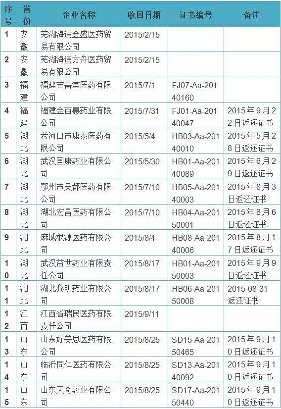 三、被收回GSP證書的藥品批發(fā)企業(yè)匯總