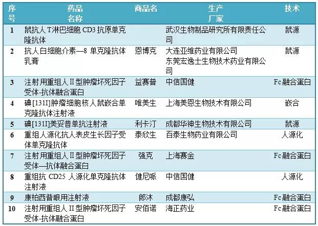 CFDA批準(zhǔn)上市的10種國內(nèi)單抗
