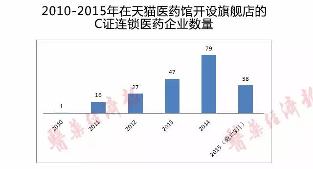 據(jù)統(tǒng)計(jì),截至2015年9月,在天貓醫(yī)藥館開(kāi)設(shè)大藥房旗艦店的C證連鎖醫(yī)藥企業(yè)數(shù)量為208家。按年劃分,2014年開(kāi)店數(shù)量最多,達(dá)到79家,平均每月超過(guò)6家。2015年1-9月開(kāi)店數(shù)量為38家,平均每月約為4家,開(kāi)店數(shù)量低于2014年。