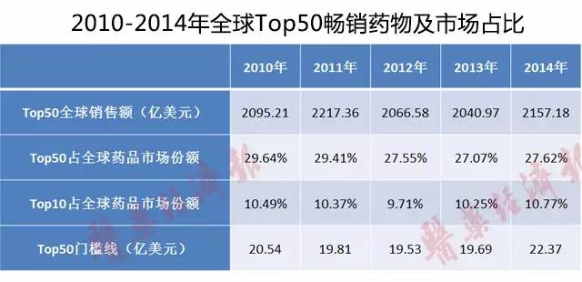 根據(jù)EvaluatePharm的統(tǒng)計顯示,2014年全球暢銷藥物50強(qiáng)總銷售額達(dá)到了2157.18億美元,占全球處方藥及OTC藥物市場總額的27.62%,相比2013年有所提升,該比例在2010-2014年均保持在27%以上。其中前十強(qiáng)占總體藥物市場的10.77%,該比例自2012年低于10%以下,為9.71%外,歷年均在10%以上??梢钥闯鋈驎充N藥50強(qiáng)對世界藥物市場格局的影響巨大。受多種因素的而影響,傳統(tǒng)重磅藥物的市場主導(dǎo)地位正在不斷削弱,暢銷藥物對全球銷售額的貢獻(xiàn)率處于下降趨勢。