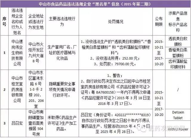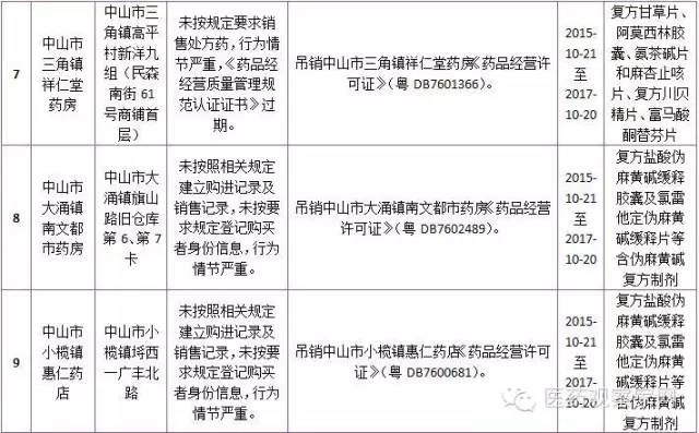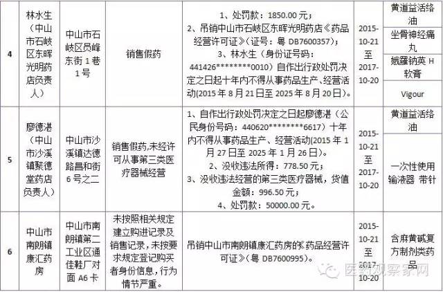 根據(jù)《行政處罰法》、《政府信息公開條例》、《廣東省查處生產(chǎn)銷售假冒偽劣商品違法行為條例》和《廣東省食品藥品監(jiān)督管理局關(guān)于食品藥品違法違規(guī)企業(yè)“黑名單”的管理規(guī)定(試行)》的規(guī)定,現(xiàn)將我局2015年第二期食品藥品違法違規(guī)企業(yè)“黑名單”信息向社會公布。 從公示的信息可以看出,3個自然人分別由于未取得《藥品生產(chǎn)許可證》生產(chǎn)加工藥品、銷售假藥、未經(jīng)許可從事第三類醫(yī)療器械經(jīng)營被罰十年內(nèi)不得從事藥品生產(chǎn)、經(jīng)營活動。 中山市南朗鎮(zhèn)康匯藥房、中山市三角鎮(zhèn)祥仁堂藥房、中山市大涌鎮(zhèn)南文都市藥房、中山市小欖鎮(zhèn)惠仁藥店等四家藥房由于未按照相關(guān)規(guī)定建立購進記錄及銷售記錄,未按要求規(guī)定登記購買者身份信息,行為情節(jié)嚴(yán)重,均被吊銷《藥品經(jīng)營許可證》 。 以下為具體詳情