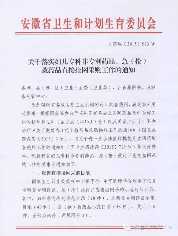 安徽關(guān)于落實婦兒??品菍@幤?、急(搶)救藥品直接掛網(wǎng)采購工作的通知