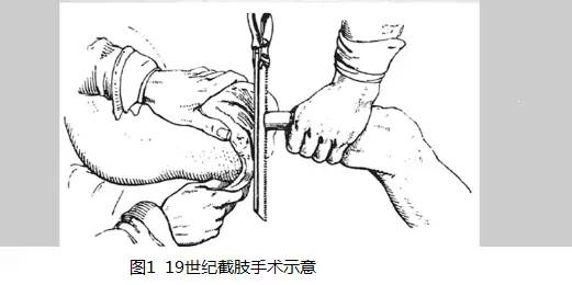 回到Liston的手術(shù)過(guò)程,顯然他不是故意要?jiǎng)?chuàng)造這個(gè)記錄的,實(shí)在是當(dāng)時(shí)的條件所限。在那個(gè)年代標(biāo)準(zhǔn)的截肢手術(shù)流程是這樣的(圖1):患者的監(jiān)護(hù)人將患者固定,然后醫(yī)生的助手壓住患者的股動(dòng)脈(肱動(dòng)脈)或者條件好時(shí)用止血帶壓迫上述動(dòng)脈止血。之后逐層分離組織,助手扯開(kāi)患者的肌肉及其他組織暴露骨頭,醫(yī)生迅速截去患肢。為了追求速度,Liston醫(yī)生用的截肢工具并非圖示的鋸形工具,據(jù)說(shuō)他使用的是斧子。由圖中我們可以看出助手的手離手術(shù)點(diǎn)很近,在快速操作的過(guò)程中自然也可能被一并拿下。而那名旁觀者,其實(shí)是一名出于學(xué)習(xí)目的來(lái)觀看Liston醫(yī)生手術(shù)的醫(yī)生,這種口口相傳的模式也是當(dāng)時(shí)醫(yī)學(xué)發(fā)展的普遍模式之一(另一種說(shuō)法是他被Liston醫(yī)生傷到兩腿間要害因此死去)。想象一下當(dāng)時(shí)的手術(shù)場(chǎng)面:沒(méi)有麻醉和無(wú)菌設(shè)施的情況下,患者因?yàn)樘弁炊樕n白的在慘叫或是滿身冷汗,家屬和助手用盡全力按住掙扎的患者,醫(yī)生則要比殺手更加穩(wěn)準(zhǔn)狠而神速的切掉患處,還有瞪大了好奇的眼睛的圍觀群眾……