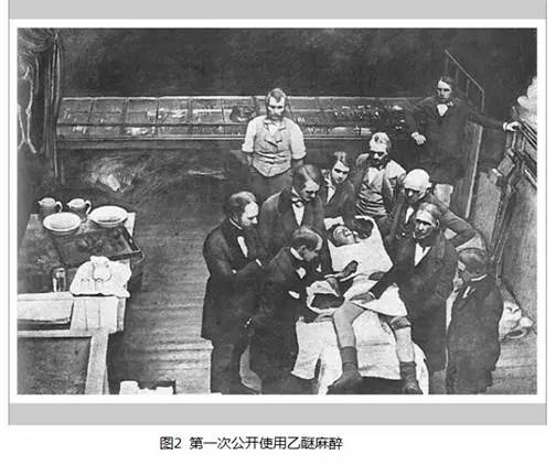一直到1846年,千呼萬(wàn)喚始出來(lái)??!終于有人開(kāi)始反思,站在時(shí)代的前沿提出建設(shè)性的意見(jiàn)——麻醉!在這外科歷史上轉(zhuǎn)折性的一年,Henry Jacob Bigelow記載了乙醚吸入麻醉在外科手術(shù)中的作用(圖2),有了這個(gè)利器,外科手術(shù)方式開(kāi)始革新。因?yàn)椴∪吮灰颐崖樽砗笫チ送从X(jué),有利于外科醫(yī)生井井有條的處理手術(shù)過(guò)程。有意思的地方是,乙醚的使用還涉及到一個(gè)公案——實(shí)際上首先在外科手術(shù)中使用乙醚麻醉的是一個(gè)叫做William Morton的牙醫(yī),但是他將把這個(gè)方法私藏起來(lái),不愿意和同行分享,而B(niǎo)igelow未得到他的同意將他的方法(準(zhǔn)確的說(shuō)是Morton的發(fā)現(xiàn))公布出來(lái)。
