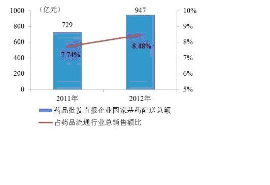 根據(jù)商務(wù)部統(tǒng)計(jì)數(shù)據(jù)顯示,2012年國家基本藥物銷售增幅較快,參與國家基本藥物配送的藥品批發(fā)直報(bào)企業(yè)國家基藥配送總額達(dá)到947億元,較2011年增長23%;占藥品流通行業(yè)總銷售額比重約為8.48%,較2011年增長74個(gè)百分點(diǎn)。