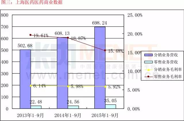 上海醫(yī)藥的營收數(shù)據(jù)中,醫(yī)藥商業(yè)貢獻較大,占比88%。2015 年1-9 月,上海醫(yī)藥醫(yī)藥分銷業(yè)務實現(xiàn)營業(yè)收入人民幣698.24億元,同比增長16.00%,毛利率5.92%,扣除兩項費用后營業(yè)利潤率為2.74%;藥品零售業(yè)務實現(xiàn)營業(yè)收入人民幣35.05億元,同比增長14.00%,毛利率15.48%,扣除兩項費用后營業(yè)利潤率為1.31%。