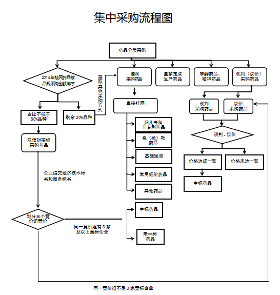 根據(jù)2014年度全省醫(yī)療衛(wèi)生機構(gòu)藥品網(wǎng)上采購金額,將各類藥品采購金額按百分比排序,占比排序累計不低于 80%,除婦兒??品菍@幤贰⒓保〒專┚人幤?、基礎(chǔ)輸液、常用低價藥品、國家定點生產(chǎn)藥品、麻醉藥品和第一、二類精神藥品外,經(jīng)評審分組后同一競價組有效競標(biāo)企業(yè)在3家及以上的藥品,由省政府采購中心采取雙信封制公開招標(biāo)采購。對已納入招標(biāo)采購目錄但經(jīng)評審分組后同一競價組有效競標(biāo)企業(yè)不足3家的藥品實行議價采購。省政府采購中心分別編制經(jīng)濟技術(shù)標(biāo)書和商務(wù)標(biāo)書。經(jīng)濟技術(shù)標(biāo)與商務(wù)標(biāo)評審分段進行。經(jīng)濟技術(shù)標(biāo)評審入圍者進入商務(wù)標(biāo)評審。商務(wù)標(biāo)評審中,同一評審分組依據(jù)中標(biāo)規(guī)則確定中標(biāo)產(chǎn)品。醫(yī)療衛(wèi)生機構(gòu)作為采購主體,按中標(biāo)價格采購藥品。
