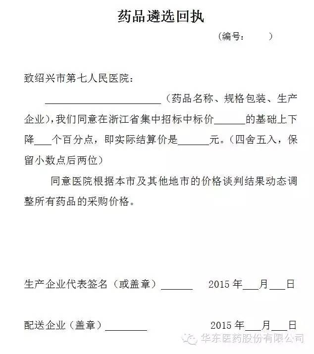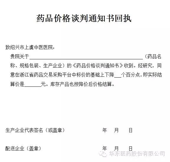 2.企業(yè)接到‘’藥品采購(gòu)談判通知書‘’后填回執(zhí),代表簽名,企業(yè)蓋章后于11月25號(hào)前交到華東相關(guān)采購(gòu)員;