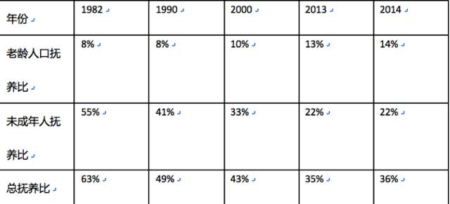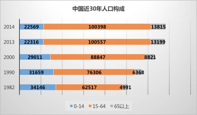 撫養(yǎng)比是非勞動人口與勞動人口的比例,用以表明每100名勞動年齡人口要負(fù)擔(dān)多少名未成年人和老年人。比例越大,居民生活壓力越大。從上圖可以看到,未成年人撫養(yǎng)比從1982年的55%驟降到2014年的22%,這表明了中國目前未成年人數(shù)量不足,未來伴隨著人口老齡化,勞動力數(shù)量將會嚴(yán)重不足,數(shù)量的不足也會傳導(dǎo)到人力成本的提升。為了國家經(jīng)濟(jì)的可持續(xù)發(fā)展,保持健康的人口結(jié)果非常關(guān)鍵。因此今年10月29日,十八屆五中全會也做出了“全面放開二胎”的政策決定。