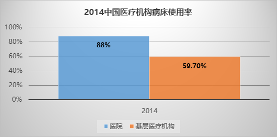 其次,從醫(yī)療機(jī)構(gòu)病床使用率的角度看,基層醫(yī)療機(jī)構(gòu)病床使用率相對(duì)較低。2014年醫(yī)院的病床使用率達(dá)到了88%,作為對(duì)比,基層醫(yī)療機(jī)構(gòu)的病床使用率只有59.7%,相當(dāng)于每10張病床中,有4張?zhí)幱陂e置狀態(tài)。這顯示未來中國基層醫(yī)療機(jī)構(gòu)在提高使用率上仍有較大空間。