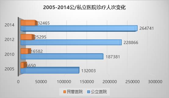 目前,民營醫(yī)院在數(shù)量上已經(jīng)與公立醫(yī)院旗鼓相當(dāng)(13153(民營):13326(公立)),雖然在診療人次、醫(yī)師力量方面與公立醫(yī)院還有不小差距,但是這個(gè)差距正在逐步縮小。如圖所示,可以很明顯的看到近十余年來,民營醫(yī)院的診療人次增長較快,從2005年診療人次占總診療人次的4.80%提高到了2014年的10.92%。