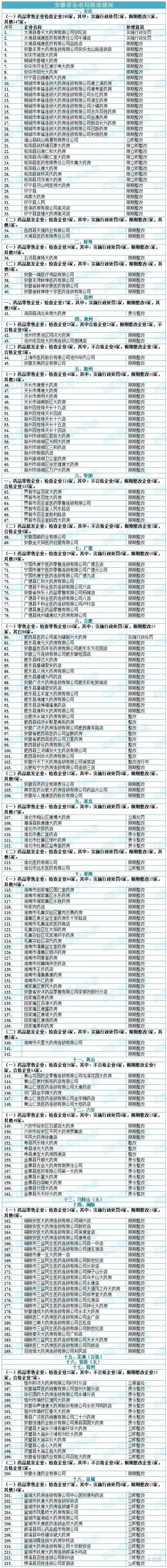 此外,此次通告還涉及到安徽省18市的檢查情況,其中:實施行政處罰5家,不合格1家,限期整改207家。