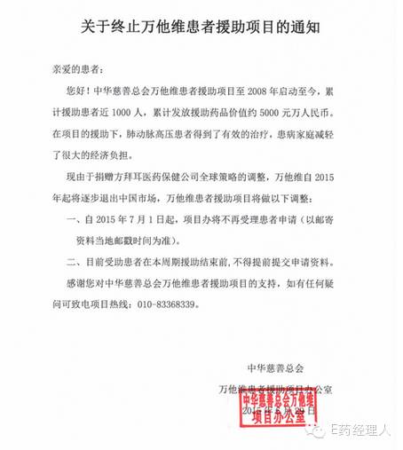 2015年6月29日,中華慈善總會官網(wǎng)上掛出了一條“關(guān)于終止萬他維患者援助項目”的通知”。通知中寫道:“現(xiàn)由于捐贈方拜耳醫(yī)藥保健公司全球戰(zhàn)略的調(diào)整,萬他維自2015年起將逐步退出中國市場。自2015年7月1日起,萬他維患者援助項目不再受理患者申請。”自10月下旬獲悉該消息以來,E藥經(jīng)理人便展開調(diào)查。