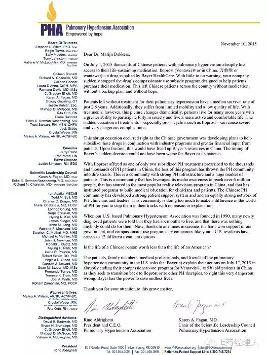 美國肺動脈高壓患者組織肺動脈高壓協(xié)會(PHA)主席兼CEO RinoAldrighetti在接受E藥經(jīng)理人采訪時表示:“對于肺動脈高壓的患者來說,藥物直接關(guān)乎他們的生死。”為聲援愛稀客,由PHA寫給拜耳全球董事會主席馬爾金·戴克斯的信中,PHA直接質(zhì)問戴克斯:“中國人的命就不如美國人的命金貴么?”但到目前為止,PHA還在等待拜耳方面的回復,而在中國,拜耳公司仍未采取任何措施。