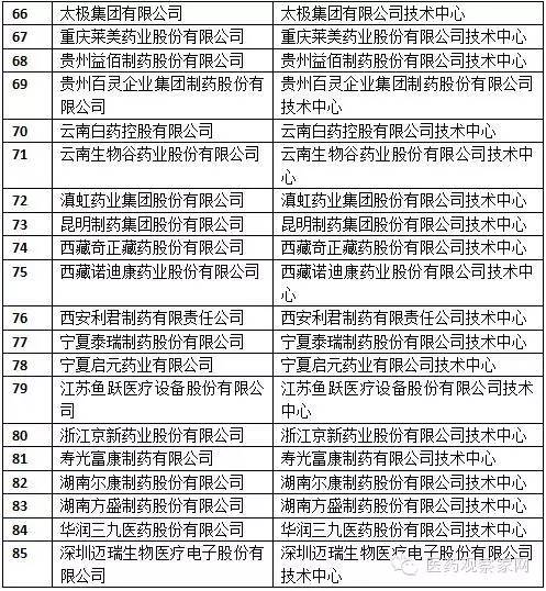 第22批批被認(rèn)定為國(guó)家企業(yè)技術(shù)中心的藥企有7家,分別為江蘇魚躍醫(yī)療設(shè)備股份有限公司、浙江京新藥業(yè)股份有限公司、壽光富康制藥有限公司、湖南爾康制藥股份有限公司、湖南方盛制藥股份有限公司、華潤(rùn)三九醫(yī)藥股份有限公司、深圳邁瑞生物醫(yī)療電子股份有限公司。此外,按照發(fā)改委同期發(fā)布的匯總名單,國(guó)家認(rèn)定技術(shù)中心數(shù)量達(dá)到了1196個(gè),筆者從中挑選出了醫(yī)藥企業(yè),統(tǒng)計(jì)發(fā)現(xiàn)藥企共85家。