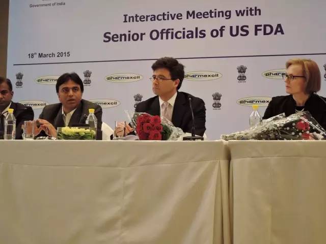 2015年3月FDA訪問印度期間,全球監(jiān)管與法規(guī)辦公室副專員Howard Sklamberg(右二)和藥品評價與研究中心合規(guī)辦公室主任Cynthia Schnedar(右一)參加了一個座談會,與印度的醫(yī)藥協(xié)會討論藥品質(zhì)量問題。