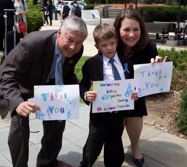 美國眾議員Fred Upton(左)、Diana DeGette(右)與一名患有罕見基因疾病的6歲男孩一起慶?!?1世紀(jì)治愈法案》獲得眾議院通過。