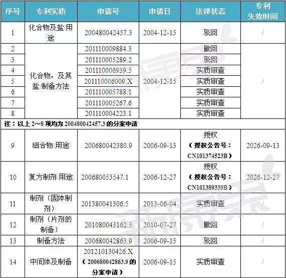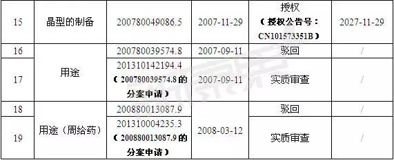 值得一提的是,首篇包含曲格列汀化合物在內(nèi)的通式化合物專利200480042457.3在中國(guó)已被駁回。在此基礎(chǔ)上,武田公司于2011年先后共申請(qǐng)了7項(xiàng)分案申請(qǐng),目前有6項(xiàng)處于實(shí)質(zhì)審查階段。其中,201110005788.1要求保護(hù)的是曲格列汀的琥珀酸鹽-該鹽正是上市活性成分。該專利若能獲得授權(quán),其專利到期時(shí)間為2024年12月15日。需特別說(shuō)明的是,琥珀酸曲格列汀的A晶型在中國(guó)并未獲得保護(hù),專利CN101573351B僅保護(hù)A晶型的制備方法。此外,用途專利201310142194.4和201310004235.3均處于實(shí)審階段。